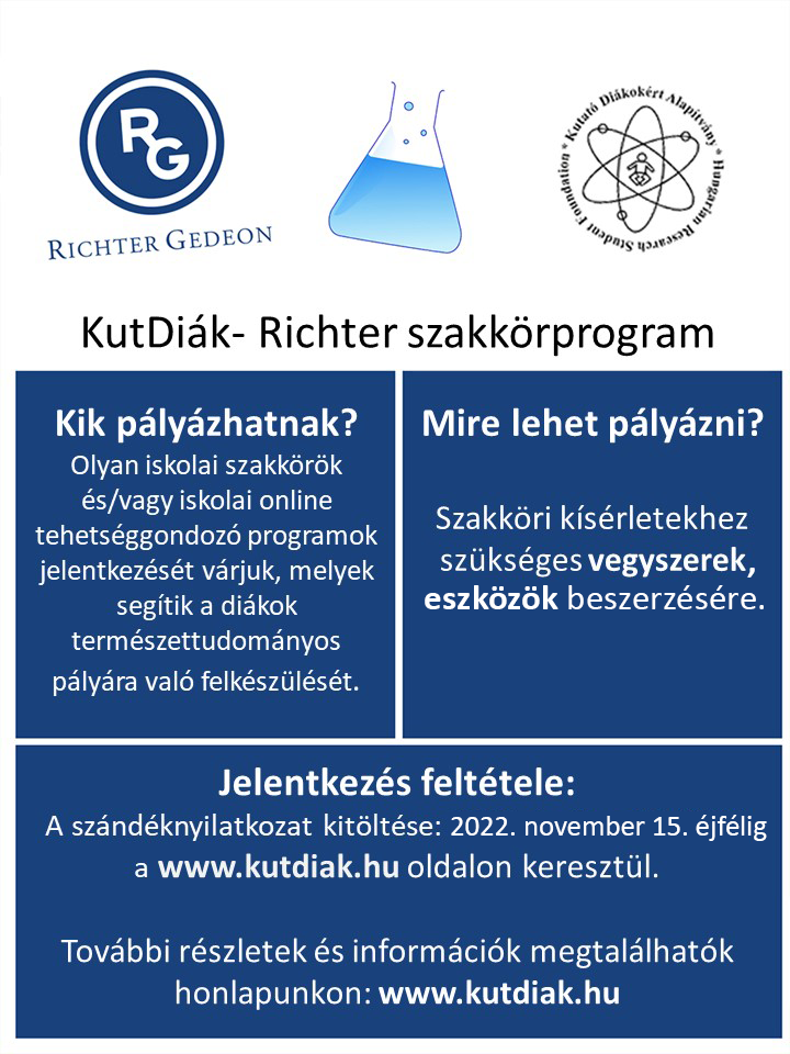 A Kutató Diákokért Alapítvány és a Richter Gedeon Nyrt. között létrejött együttműködés keretein belül pályázati programot hirdetünk meg magyarországi iskolai szakkörök és/vagy iskolai online tehetséggondozó programok részére.